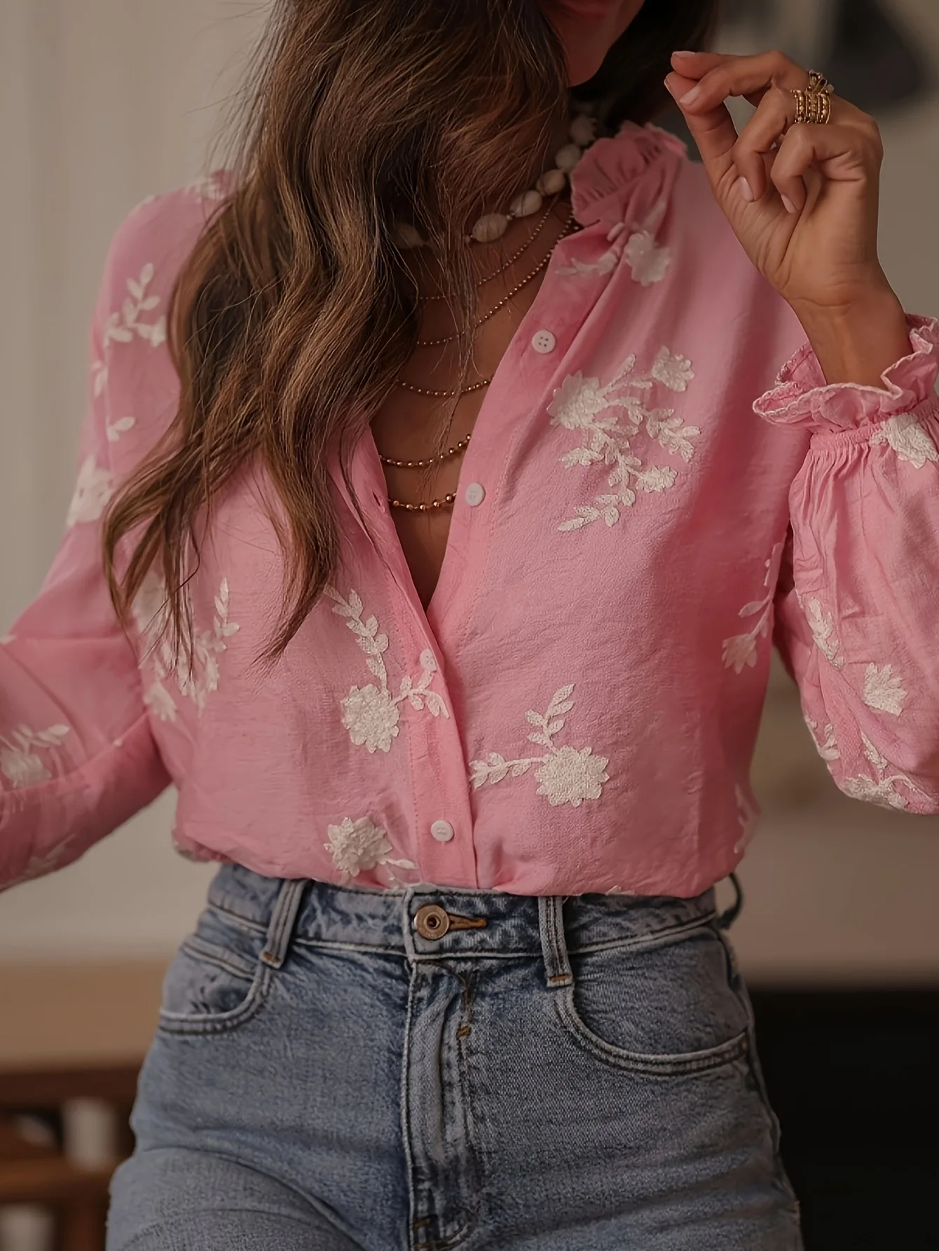 Women's Clothing 2025 Spring Autumn Fashion Casual Long-sleeved Printed Blouse with A Collar and Puff Sleeves Office Lady Shirt